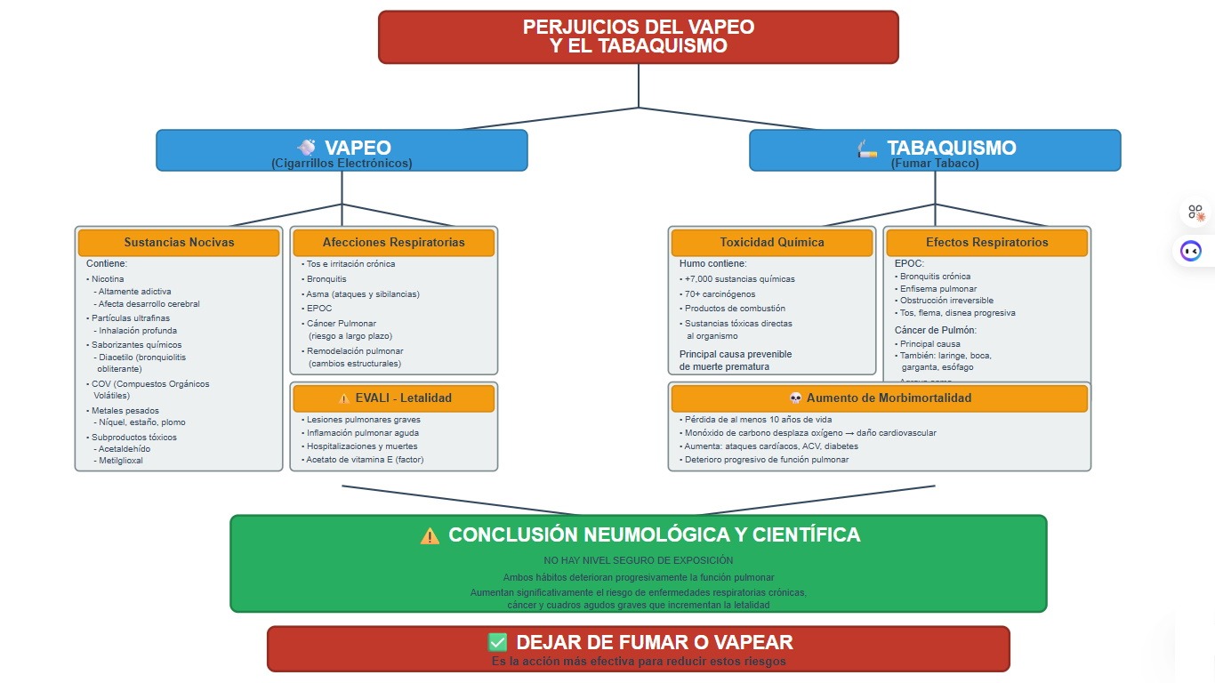 Desde el punto de vista neumológico y con base científica, no hay un nivel seguro de exposición al aerosol de vapeo ni al humo del tabaco. Tanto el vapeo como el tabaquismo introducen sustancias tóxicas y carcinógenas que deterioran progresivamente la función pulmonar y aumentan significativamente el riesgo de desarrollar enfermedades respiratorias crónicas, cáncer y cuadros agudos graves que incrementan la letalidad. Dejar de fumar o vapear es la acción más efectiva para reducir estos riesgos.